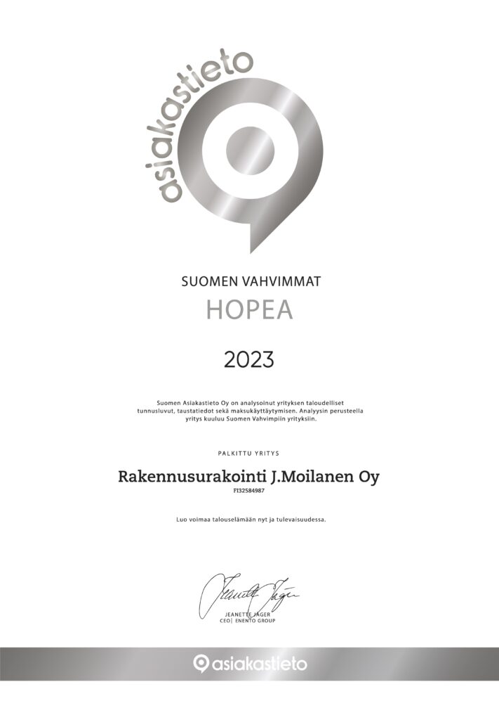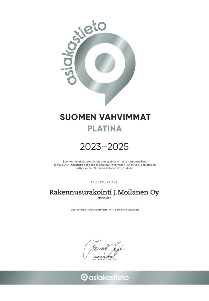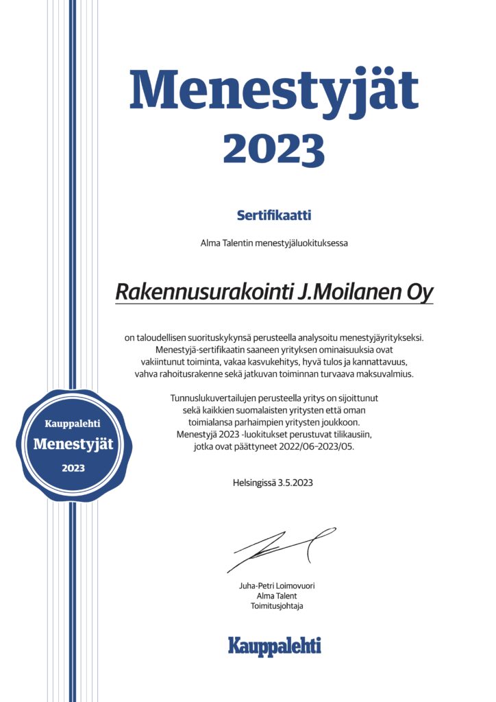 Olemme ansainneet useamman Menestyjä- ja Suomen Vahvimmat -sertifikaatit, jotka kertovat vakuuttavasta luotettavuudestamme.